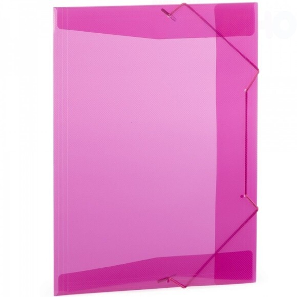 Modelo confeccionado em material plástico colorido dispõe de elásticos para facilitar o seu fechamento e aba para garantir que os papéis não caiam da pasta.